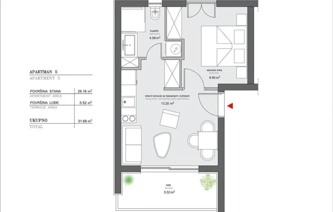 Studio apartment for sale in a new building in Meljine, Herceg Novi. This 31.68 sq m studio apartment is located in a modern building. It features a convenient layout and a 5.52 sq m terrace. This...
